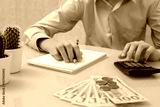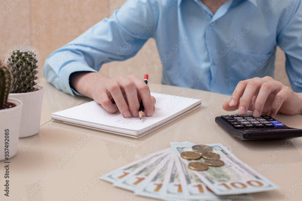 a man considers on a calculator monthly expenses, payments on loans, plans a family budget, payment of utilities