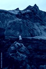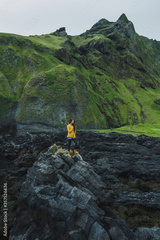 Woman walking by black stone rocky volcanic coastline of Vestmannaeyjar island in Iceland. Northern nature landscape with black beach and green mountains.