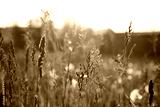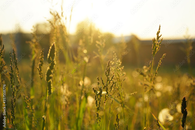 Sunset in the village. Grass in the sunset light. Rural landscape background. Golden twilight.