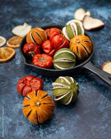 Beautiful food portrait of Wnter seasonal dried fruits with old vintage texture background and cutlery and accessories