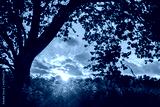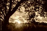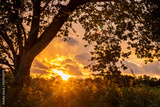 Beautiful colorful vibrant Summer sunset viewed through tree silhouette over field