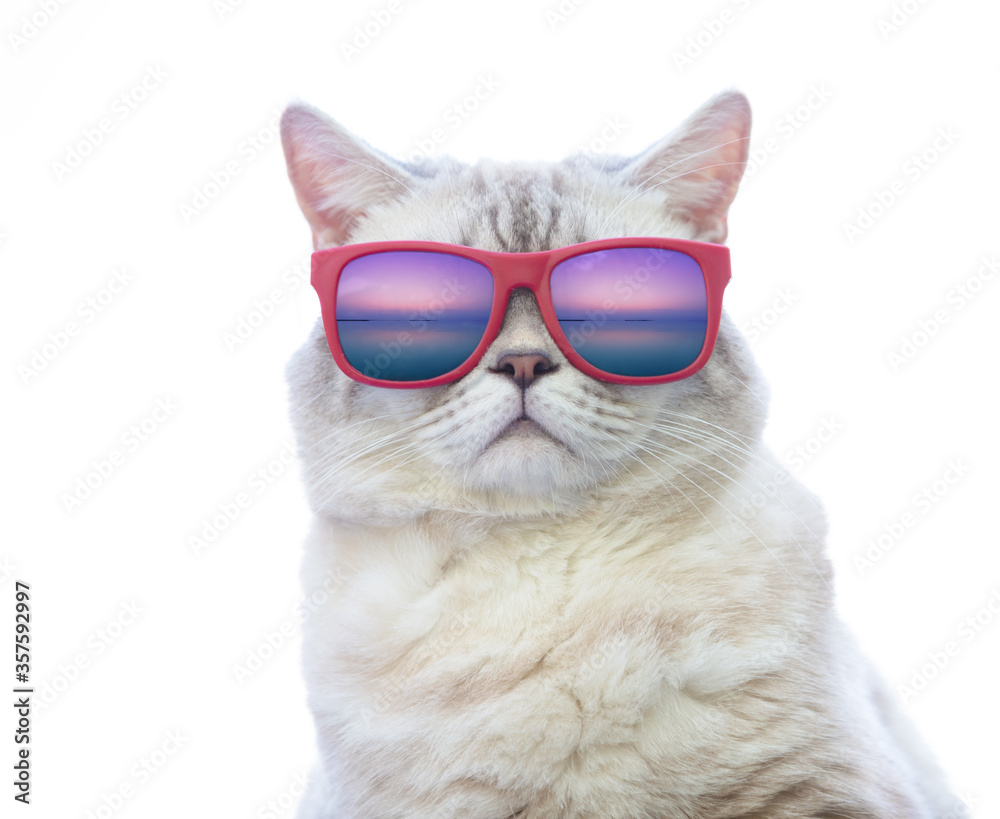 Portrait of funny cat in sunglasses with sea reflection. Cat enjoying summer. Isolated on white background. Travel concept