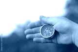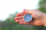 Old classic navigation compass in hand on natural background as symbol of tourism with compass, travel with compass and outdoor activities with compass