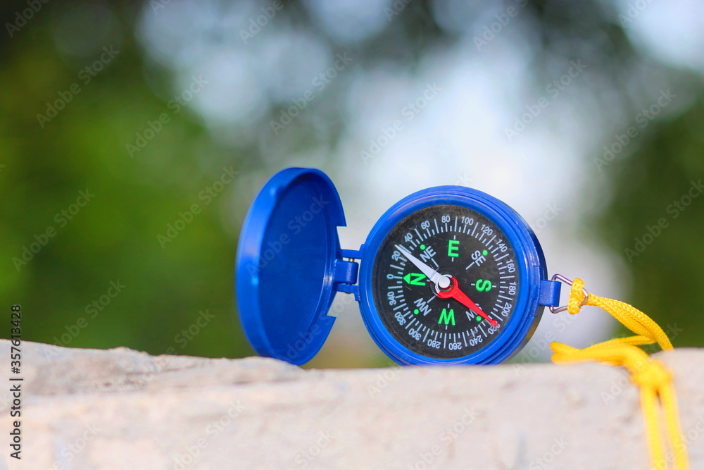 round compass on natural background as symbol of tourism with compass, travel with compass and outdoor activities with compass