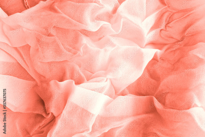 Texture of coral Wrinkled Fabric. Trendy color of clothes. Close-up.