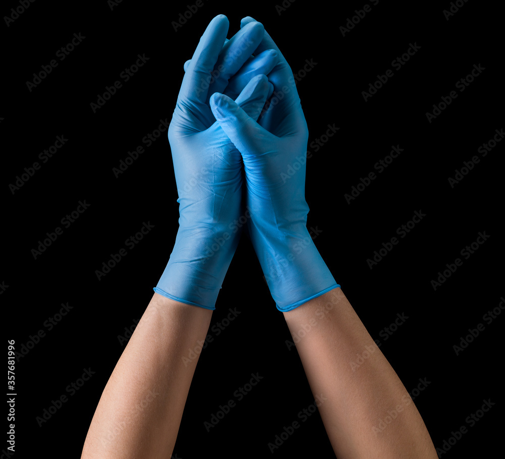Doctor's hand in sterile medical gloves together symbolizing prayer isolated