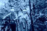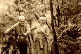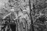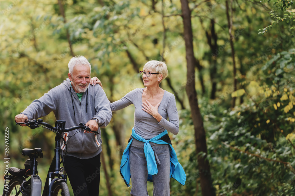 Cheerful active senior couple with bicycles walking through park together. Perfect activities for elderly people.