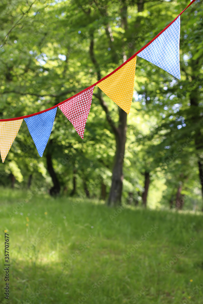 Colorful triangular bunting flags hanging among trees. Summer garden party. Outdoor birthday or wedding decoration. Midsummer, festa junina concept. Selective focus. Natural blurred background.