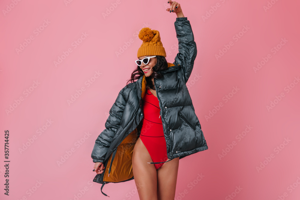 Carefree girl in down jacket dancing on pink background. Happy trendy woman in winter clothes expressing positive emotions.