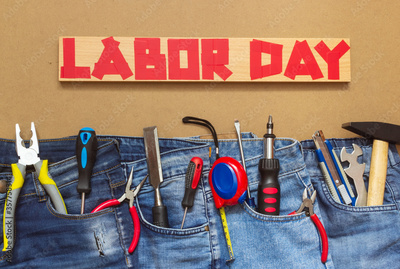 Top view of old different tools in the jeans pockets on a masonite sheet plate and duct tape text on a board, holiday concept of labor day, flat lay