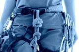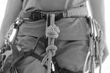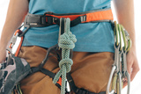 Sporty woman in harness with climbing and mountaineering equipment.