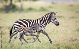 Zebra female and baby running together in Masai Mara plains Kenya