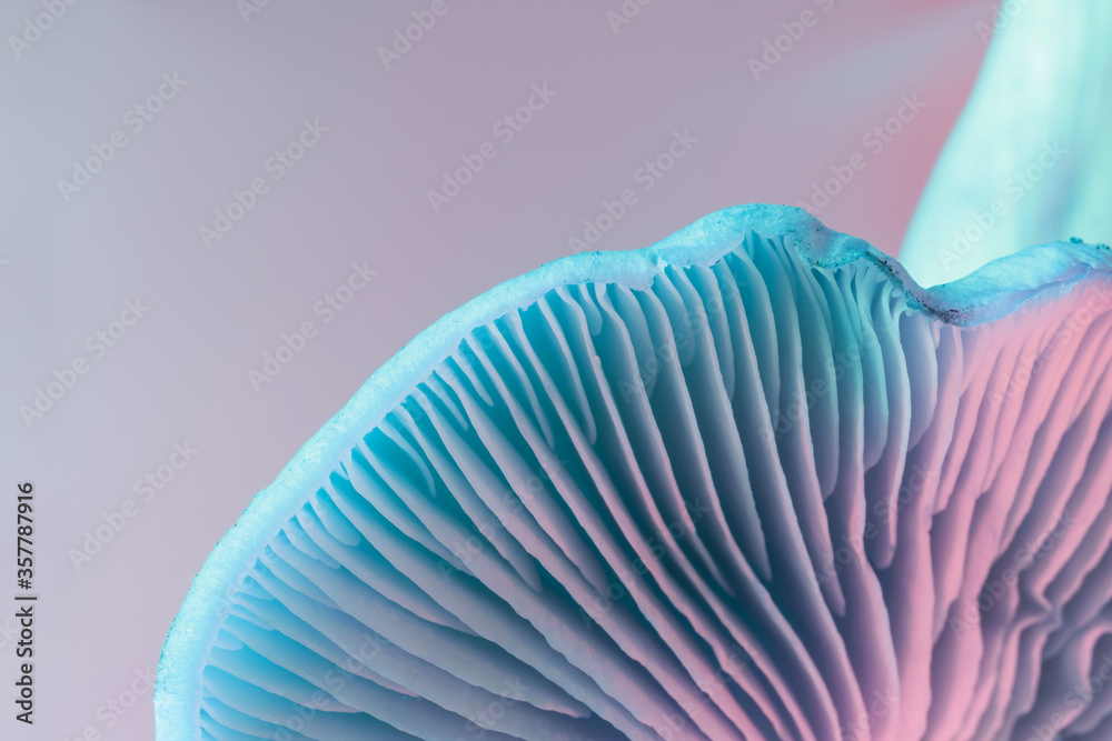 Close up bunch mushrooms color light. Beautiful plant minimal in neon light. Minimalism retro style concept. Background pattern for design. Macro Photography View.