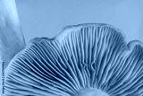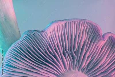 Close up bunch mushrooms color light. Beautiful plant minimal in neon light. Minimalism retro style concept. Background pattern for design. Macro Photography View.