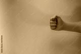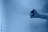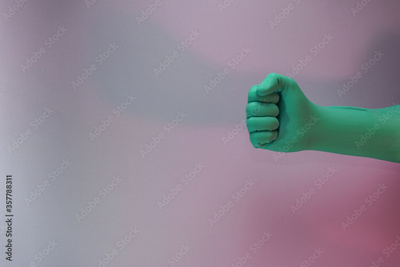 Beautiful hand green glove fist in the neon light. Minimalism retro style concept. Background pattern for design.