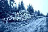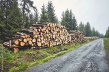 Log trunks pile by a road in forest on a foggy rainy day, color toning applied.