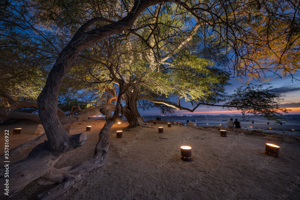 Beautiful sunset view from Tree of Life, Bahrain. The Tree of Life in Bahrain is a 9.75 meters high Prosopis cineraria tree that is over 400 years old