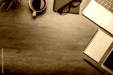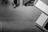 Flat lay of Office desk wooden table with office supplies with copy space
