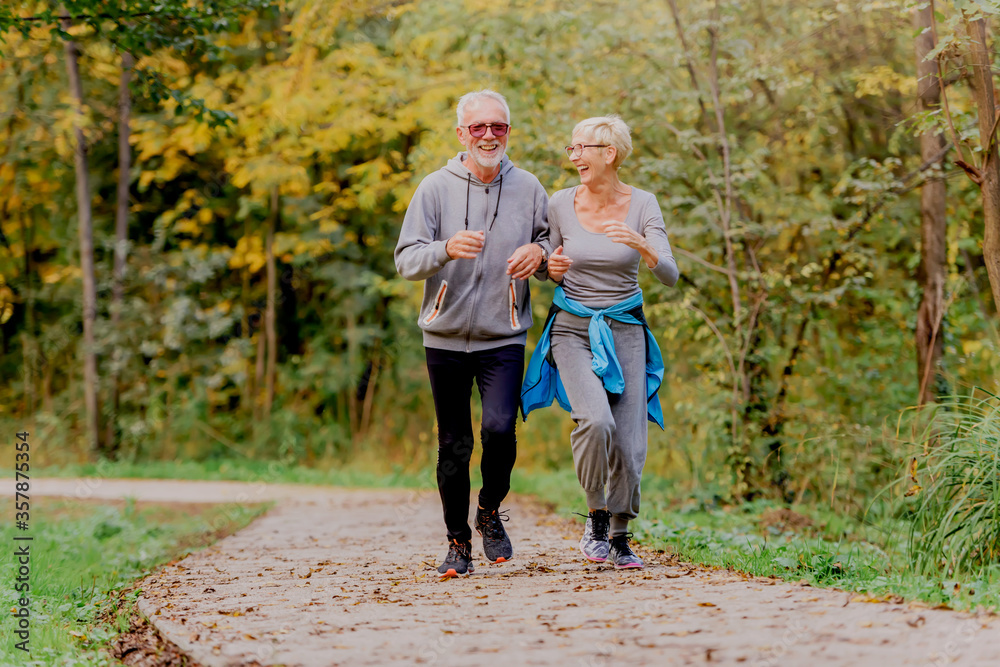 Smiling senior couple jogging in the park