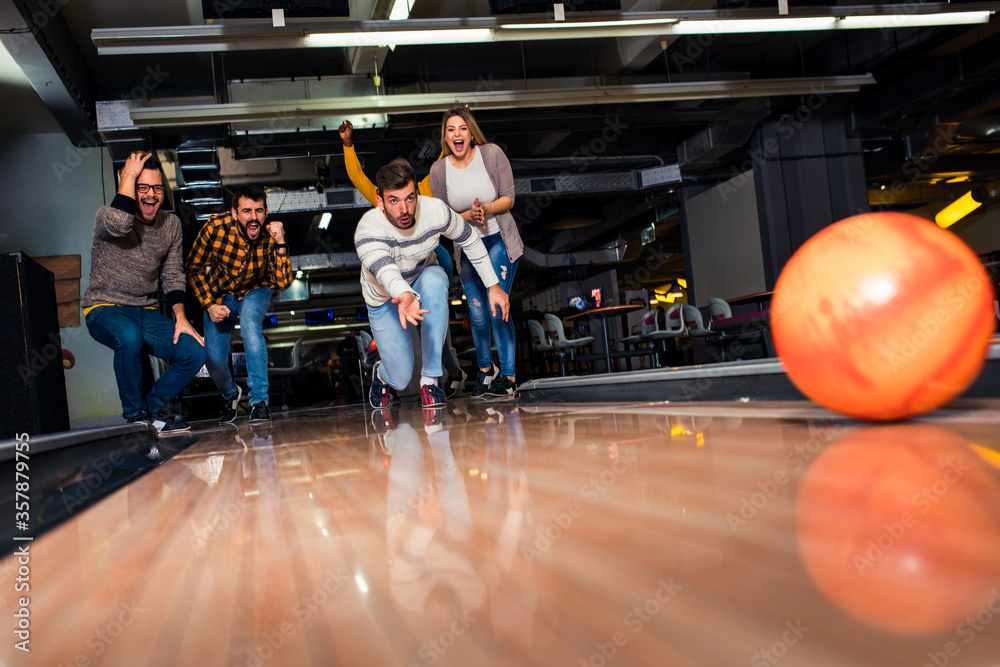 Group of friends enjoying time together laughing and cheering while bowling at club.