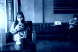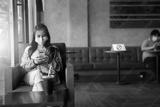 Social distancing concept.Young asian woman in facial mask sitting use social media on the cafe and distance of 6 feet from other people keep distance protect from COVID-19 viruses at coffee cafe.