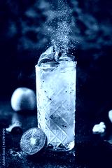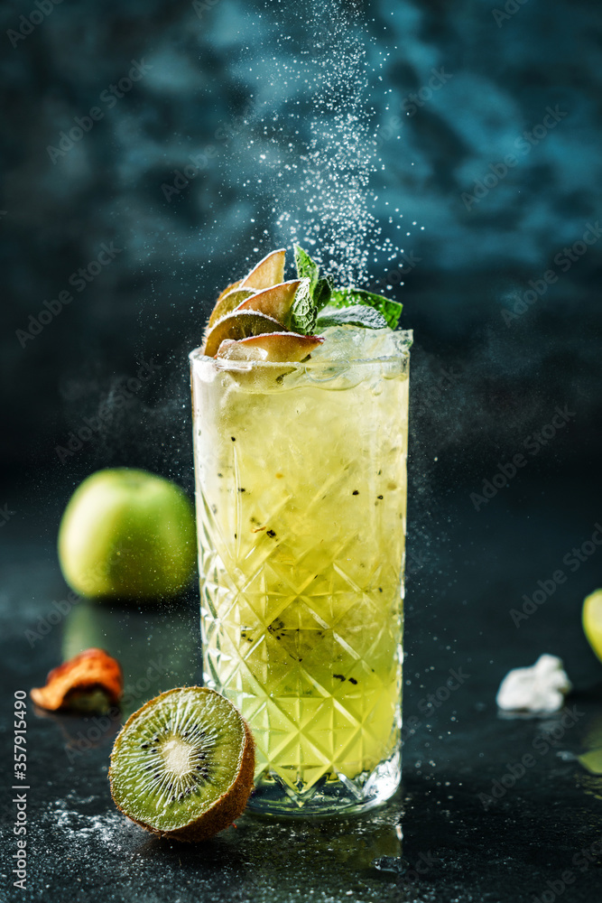 Fresh kiwi cocktail with apple, mint and powdered sugar in jar glass on dark blue background. Studio shot of drink in freeze motion, powdered sugar, drops. Summer cold drink and cocktail