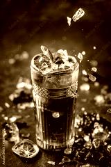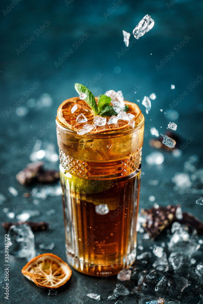Fresh cocktail with cola, lime, orange and ice in glass on dark blue background. Studio shot of drink in freeze motion, flying ice, drops, bokeh. Summer cold drink and cocktail