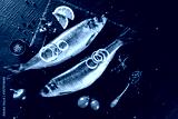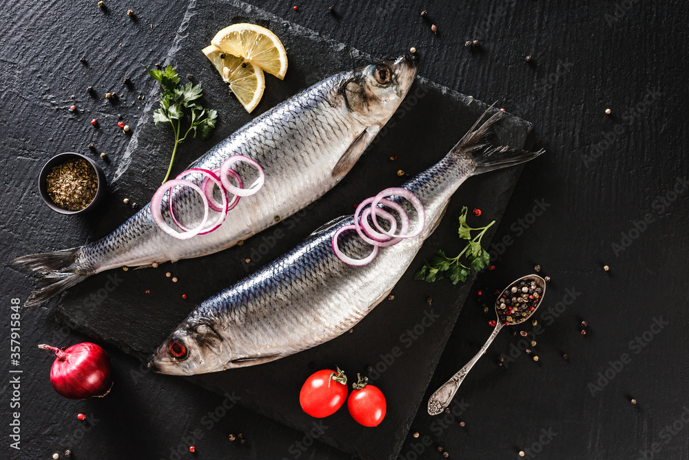 Marinated mackerel or herring fish with spices, greens and onion on slate stone background. Mediterranean food, appetizer, seafood, top view