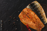 Smoked marinated mackerel fillets or fillet herring fish with spices, greens and slice of bread on plate over dark stone background. Mediterranean food, appetizer, seafood, top view