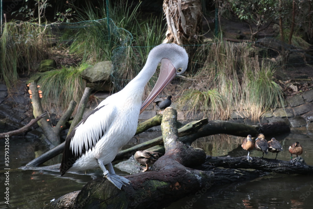 Australian pelican (Pelecanus conspicillatus) with large beak cleans feathers by the pond