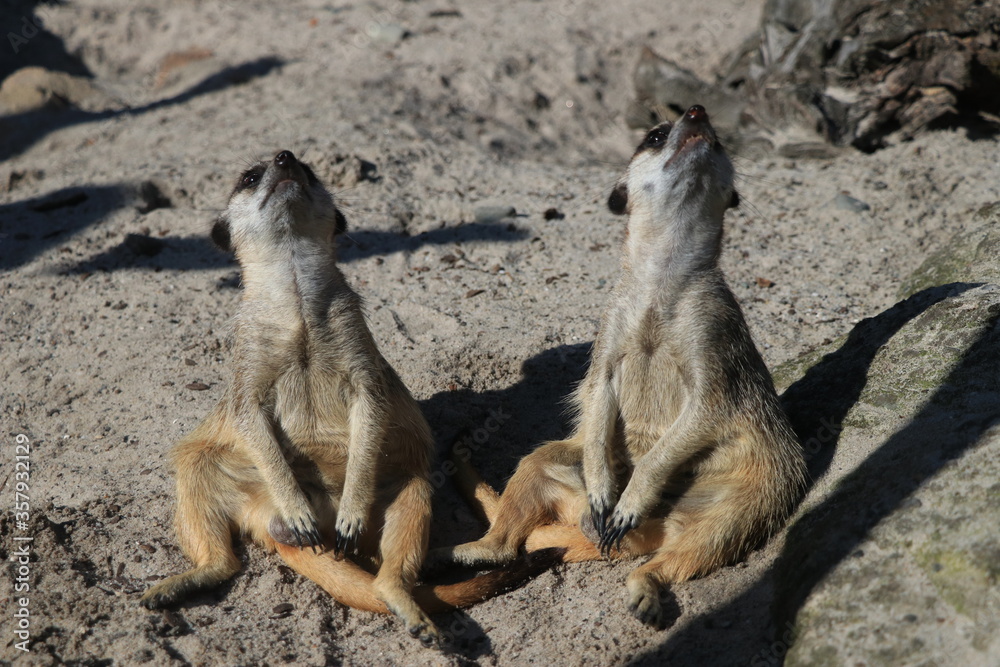 Meerkats or suricates (Suricata suricatta) sitting on the ground in a zoo and watch the sky on a sunny day. Surykatki to małe ssaki ryjące, żyjące w dużych podziemnych sieciach on african deserts
