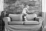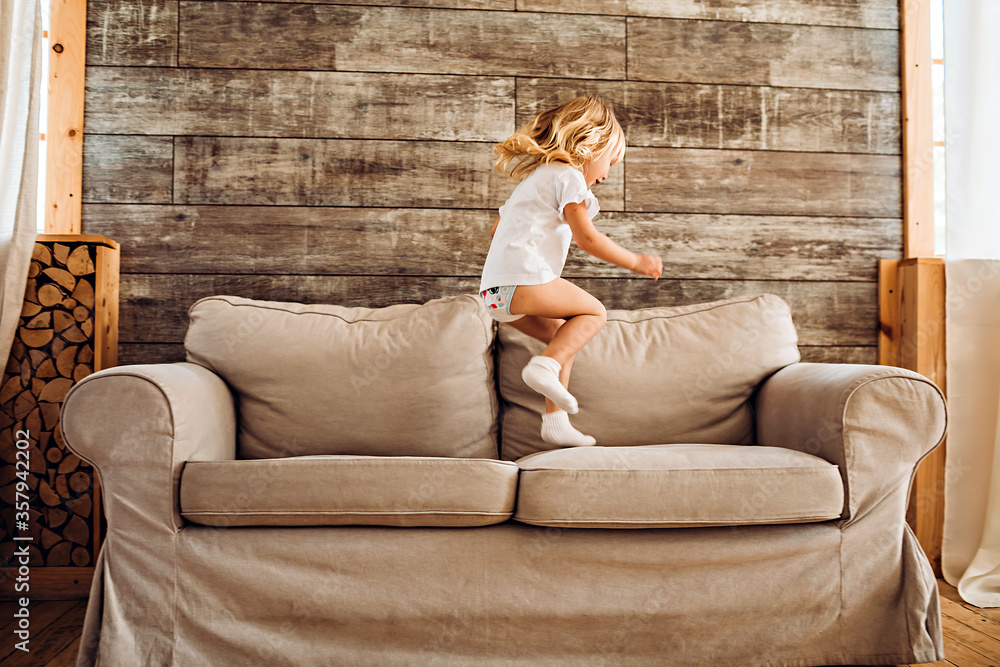 Lifestyle image of a little girl having fun and jumping on a sofa at home