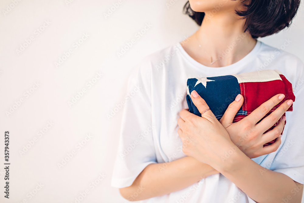 Young woman hugs folded American flag on US Independence Day, July 4th