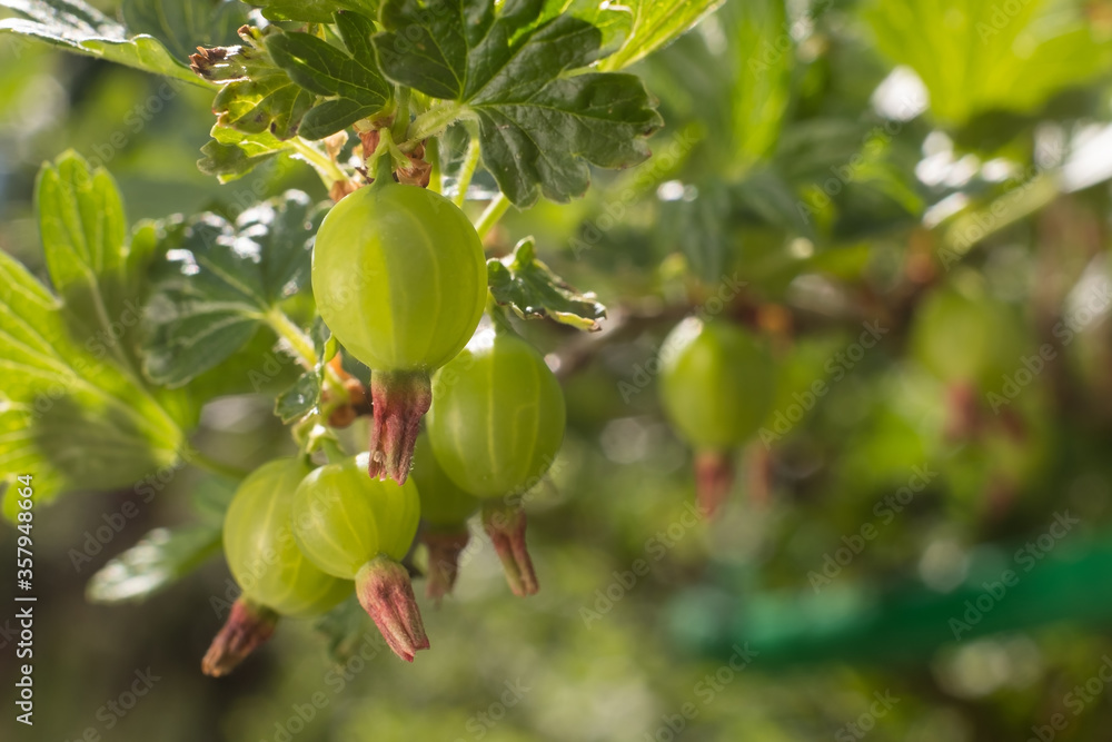 Fresh ripening gooseberries on the branch of bush