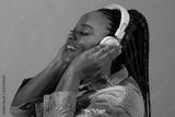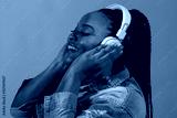 African american young woman listening to music online dancing and singing with headphones, neon light. Music and technology concept.