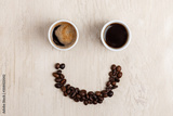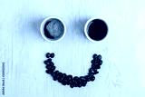 White cup of coffee and smile made of roasted coffee beans on light coloured wooden table