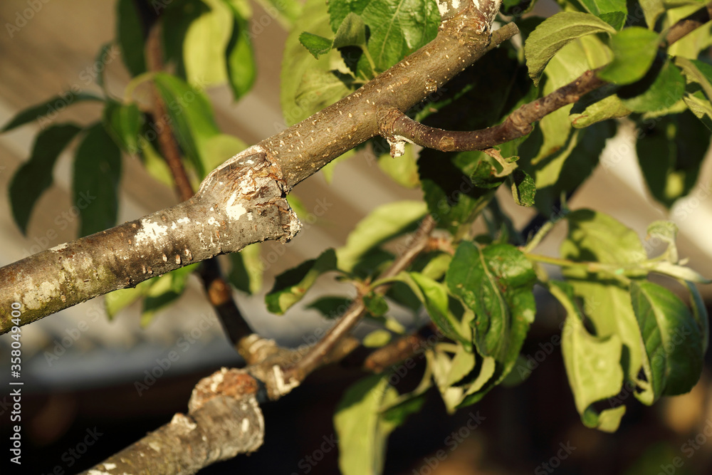 stalk overgrown with cambium, grafted on a branch of an apple tree last spring. Successful grafting fruit tree