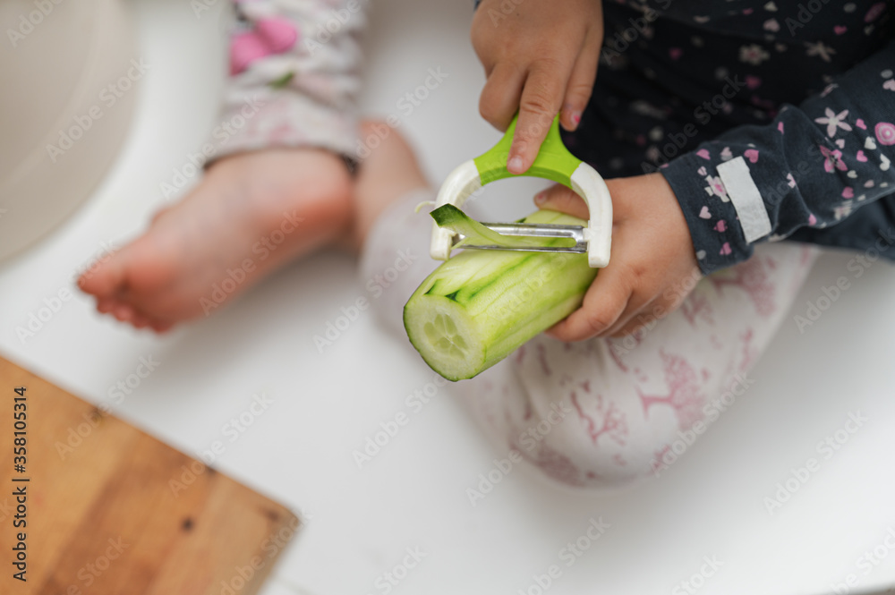 Toddler girl peeling cucumber