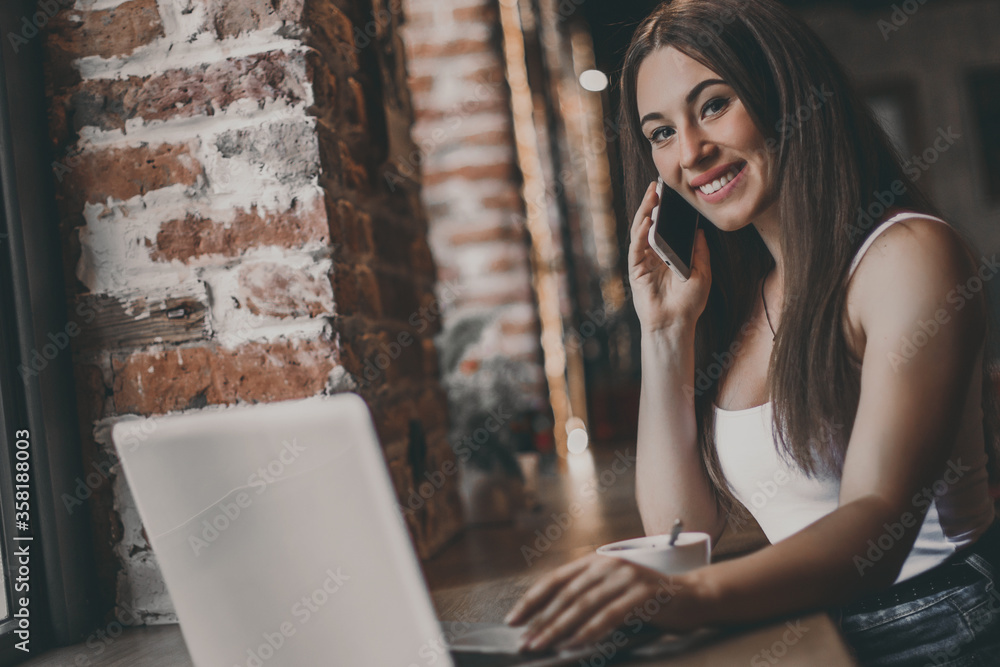 Business woman talking to the phone, working on a laptop and drinking coffee in a cafe.