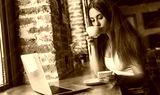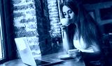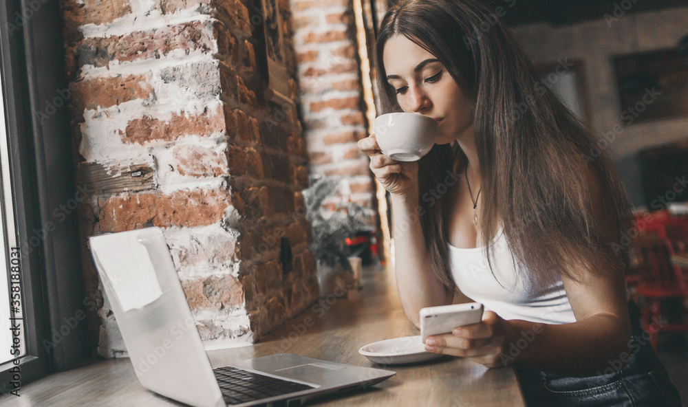 Business woman using phone, working on a laptop and drinking coffee in a cafe.