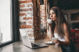 Business woman using phone, working on a laptop and drinking coffee in a cafe.