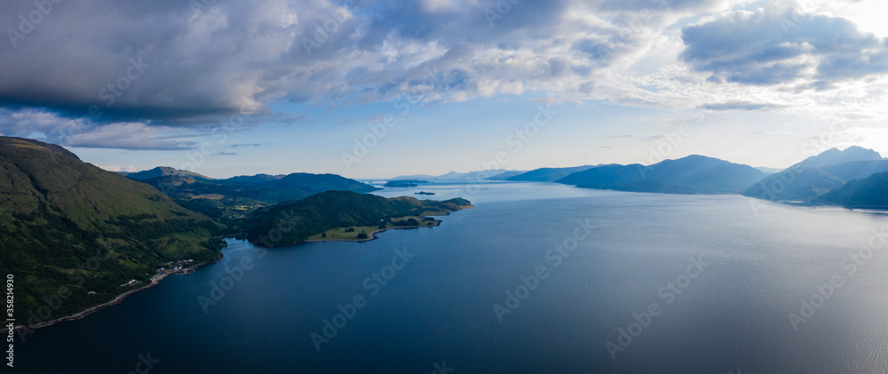 aerial image of loch linnhe on the west coast of the argyll and lochaber region of scotland near kentallen and duror showing calm blue waters and clear skies with green forest coast line