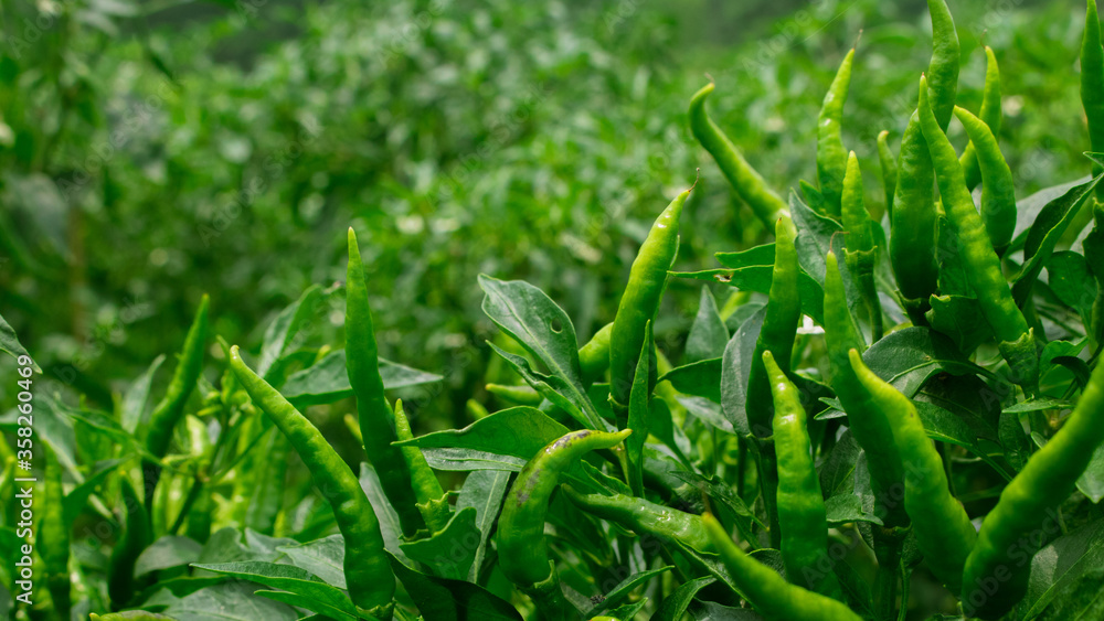Rows of green peppers in the garden. It is an improved variety of pepper in Bangladesh.
