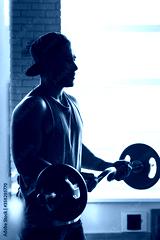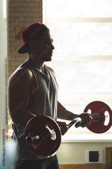 Silhouette photo of a muscular young athlete doing exercises with a barbell in the gym. Power training