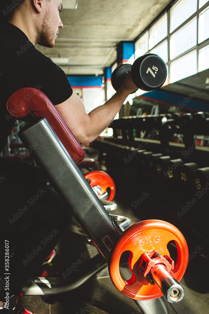 Training with dumbbells in the gym. Strength exercises for endurance.