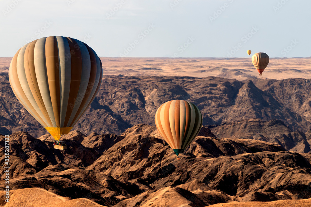 Colorful hot air balloons flying over the moon valley mountain. Africa.