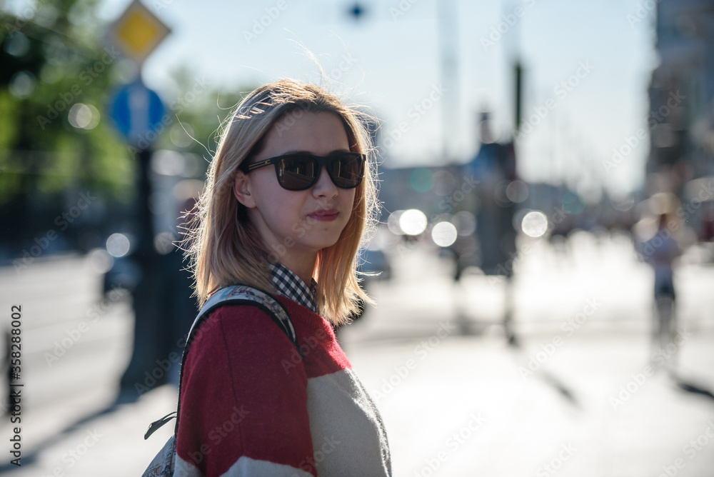 Russia, Saint Petersburg, may 30, 2020: a Young beautiful girl with red hair in the sun against the background of the city