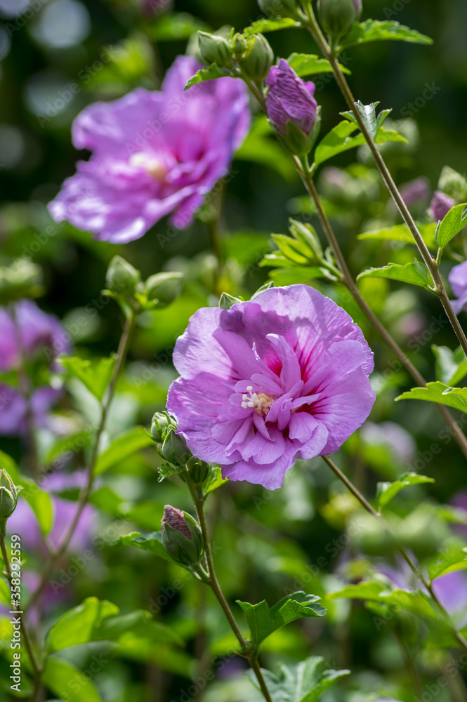 Hibiscus syriacus syrian ketmia ornamental flowering plant, violet purple flowers in bloom, green leaves