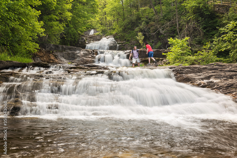a couple of hikers climbing a waterfall