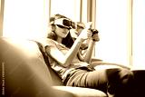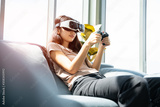 Happy young beautiful asian woman using a virtual reality headset(VR) at home.Girl in glasses of virtual reality.Augmented reality,game,future technology concept.VR.